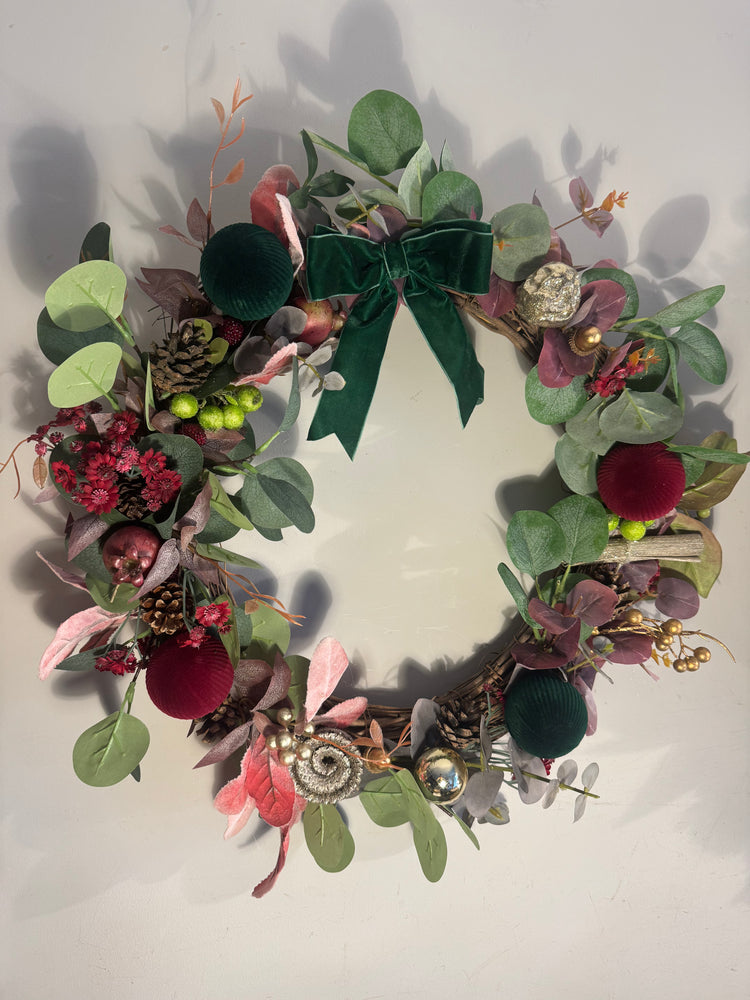 Enchanting Christmas wreath adorned with lush greenery, velvet baubles, pinecones, and a rich emerald bow — a magical blend of woodland charm and festive sparkle.