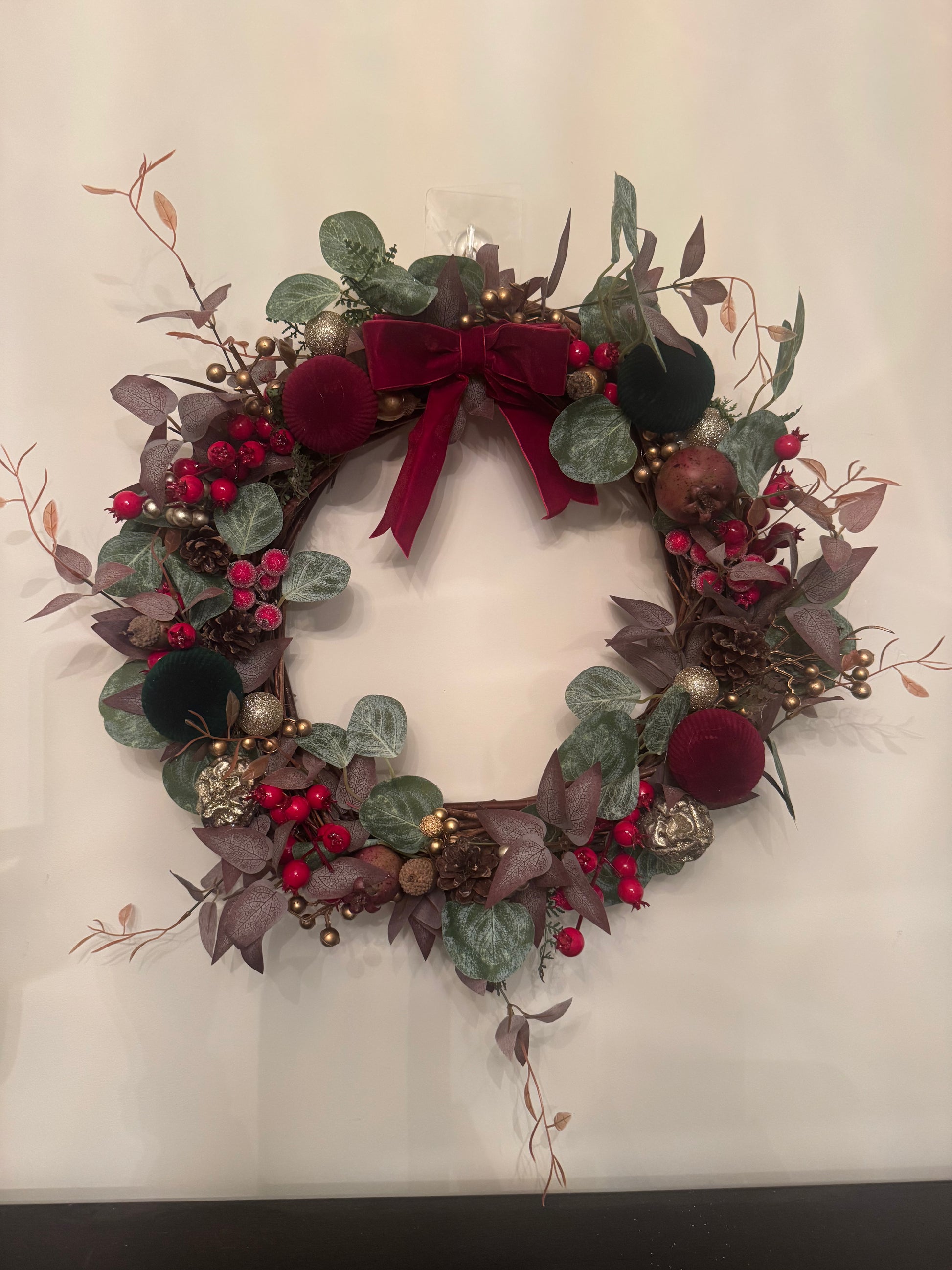 Bring timeless elegance and the fresh scent of the season to your home with this luxurious handmade Christmas wreath. Designed in rich burgundy tones, deep evergreen foliage, and abundant eucalyptus, this wreath captures the beauty of a winter woodland with a modern, romantic twist.