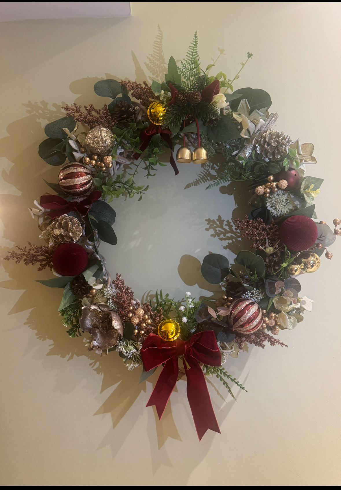 Elegant Christmas wreath adorned with red and gold ornaments, pinecones, lush greenery, and a velvet bow.